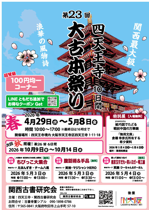 昨日はえべっさん古本祭り第4日目でした。さすがに平日ですから午前中はお客様の姿があまり見かけられず、どうなるのかと思っていましたが、午後になるとご近隣にお住まいかと思われるお客様が目立ち始め、情報宣伝の効果が感じられる動きが閉場時間まで持続しました。