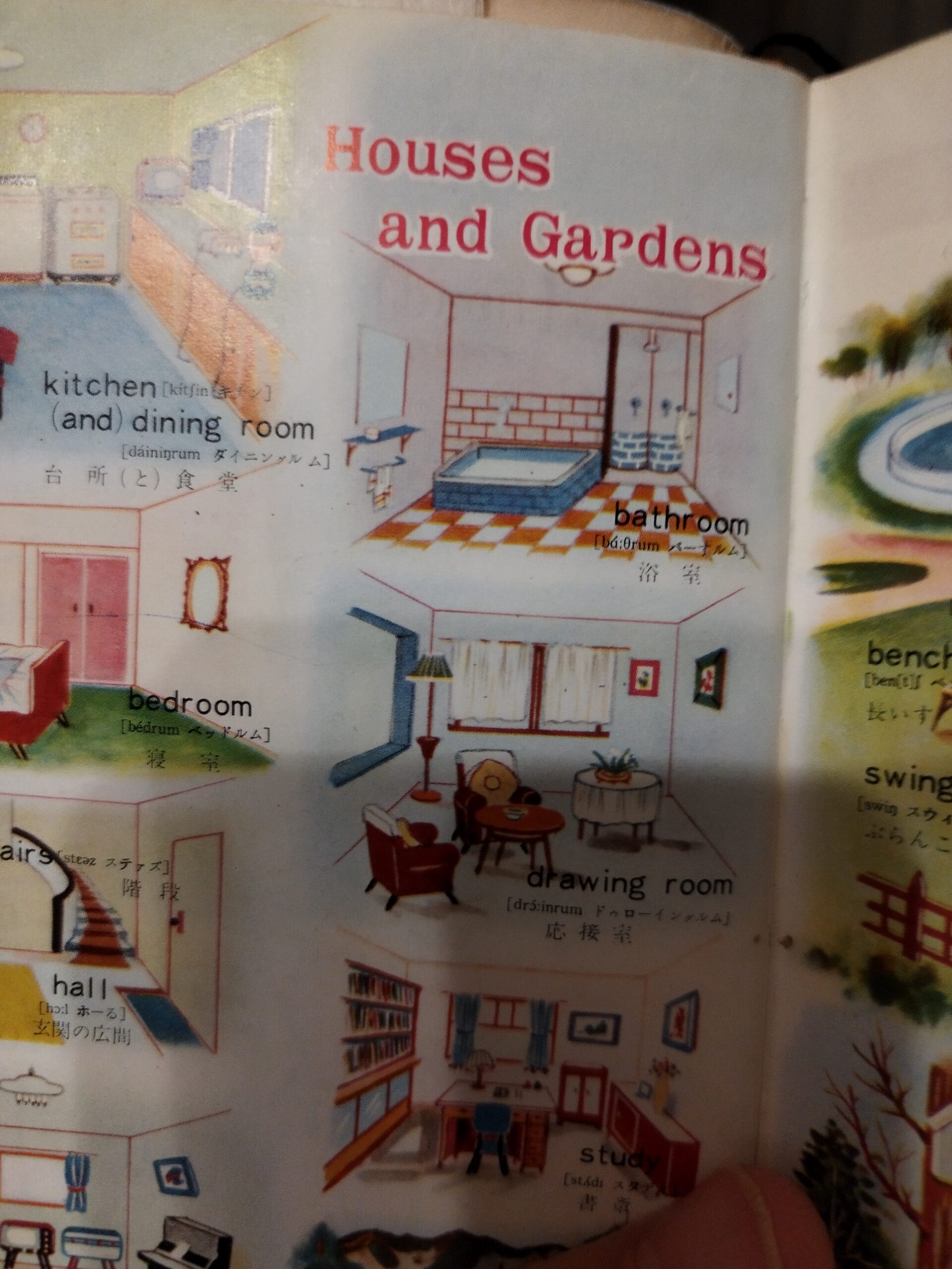 上の本は昭和38年に初版を出した旺文社の「英語入門辞典」の巻頭カラーページです。こんなに早くから、このパターンがあったみたいです。多くのカラーページの中、家のいろんな場所の説明図ですが、バスルームがまるで日本の風呂場みたいです。バスタブというのが判らない時代だったのですね。