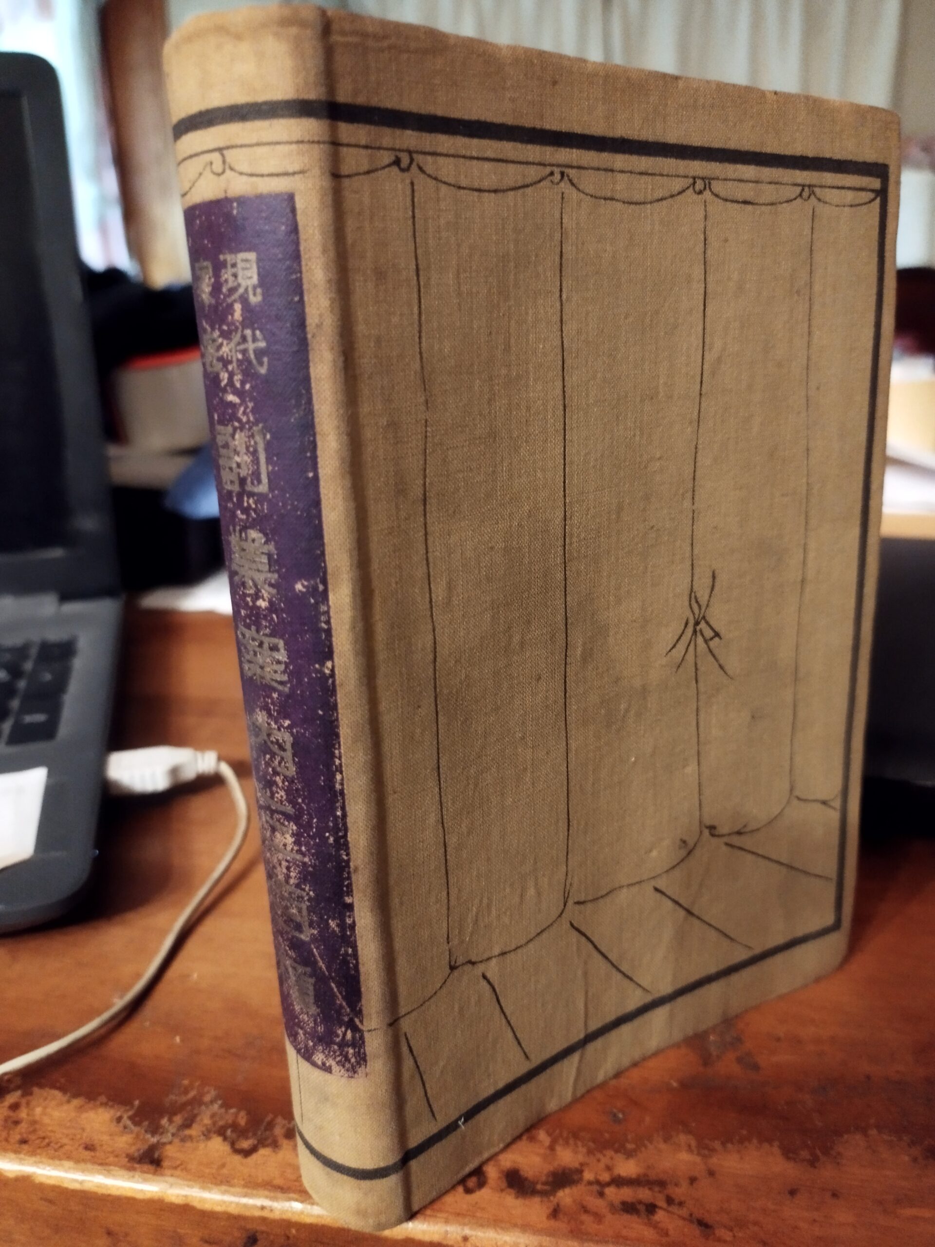 これは古本屋ならおなじみの本です、円本の一種で春陽堂から出た「日本戯曲全集」の一冊です。昭和4年に出ています。デザイン、色、手触りなど完全に同じです。これは芝居小屋の引き幕を図案化したもので、よく見ると幕の後ろから幕を引くため、手で幕の一部を握っているという、凝ったデザインです。